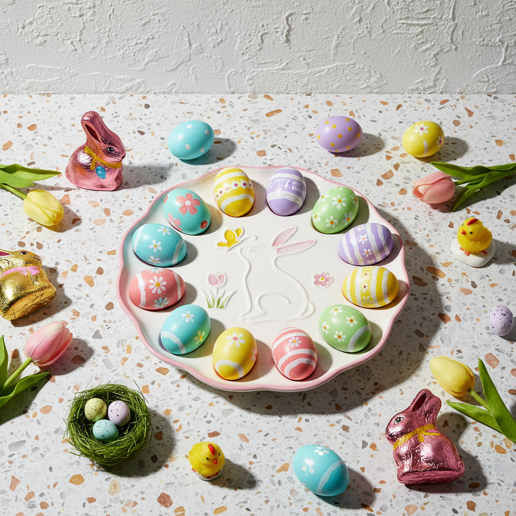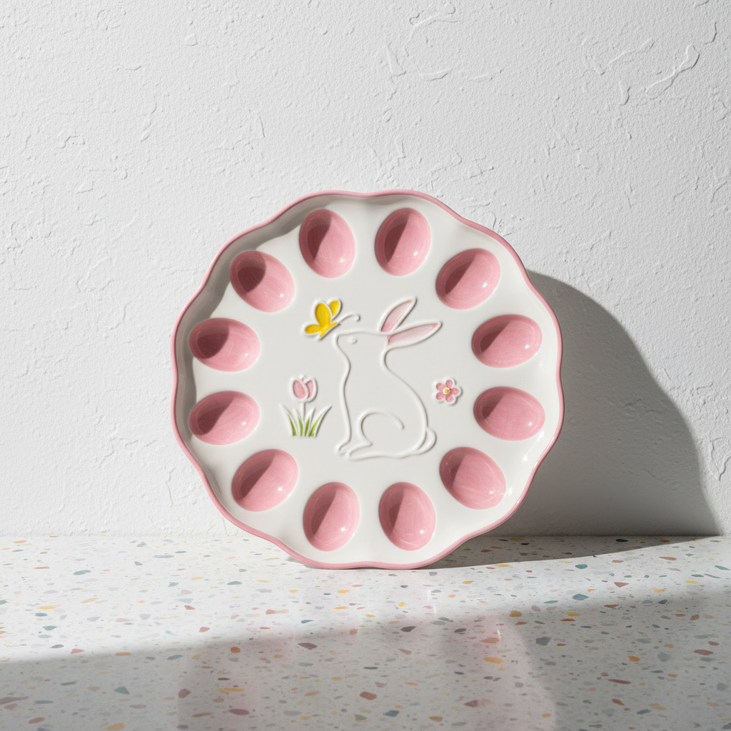 Ένας κομψός πασχαλινός δίσκος από κεραμικό, ιδανικός για τη διακόσμηση του πασχαλινού τραπεζιού. Με τη λευκή και ροζ απόχρωση του, προσφέρει μια κομψή και ζεστή αίσθηση. Τέλειος για την παρουσίαση των πασχαλινών αυγών