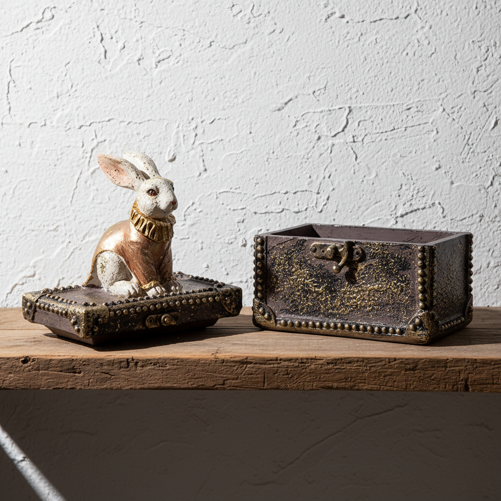 Χαριτωμένος πασχαλινός λαγός από πολυρέζιν με συνδυασμό χρυσού και λευκού. Ιδανικός για πασχαλινή διακόσμηση ή ως δώρο με στυλ.