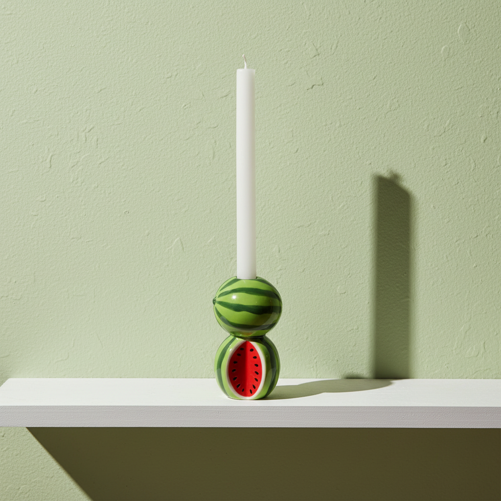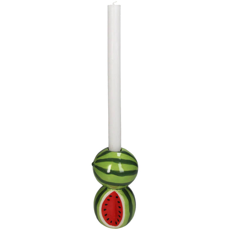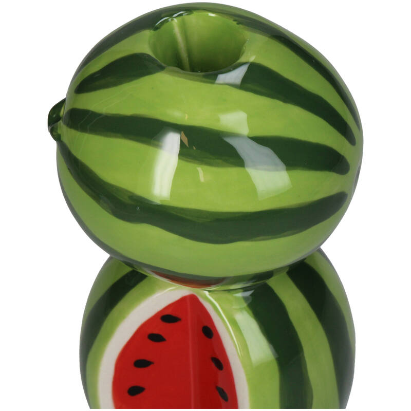 Κηροπήγιο με σχήμα καρπουζιού, κατασκευασμένο από κεραμικό υλικό σε συνδυασμό πράσινου και κόκκινου χρώματος. Ιδανικό για να προσθέσει ένα παιχνιδιάρικο και καλοκαιρινό στοιχείο στη διακόσμηση του σπιτιού σας.
